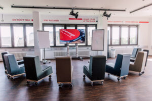 Ob Veranstaltungsformate mit klassischer Bestuhlung, Design-Thinking-Workshops mit variablen Set-ups, konzentrierte Arbeit in Kleingruppen oder hochkompetitives Bürogolf-Turnier – die Grenzen liegen im Auge der Benutzerin bzw. des Benutzers.